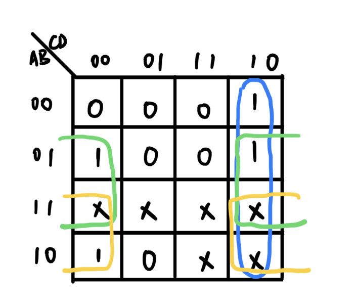 eg:Y=A'CD'+A'BC'D'+AB'C'D';约束条件:AB'CD'+AB'CD+ABC'D'+ABC'D+ABCD'+ABCD=0