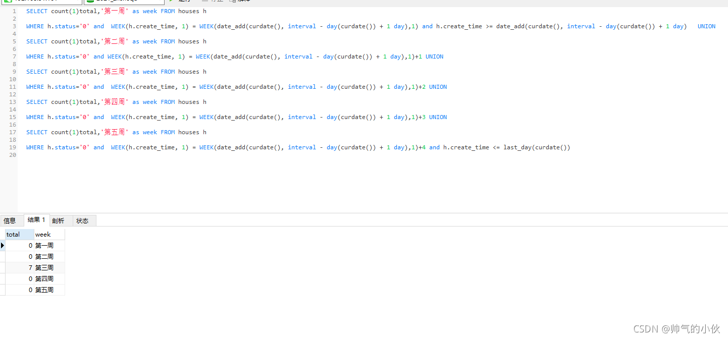 SELECT count(1)total,'第一周' as week FROM houses h