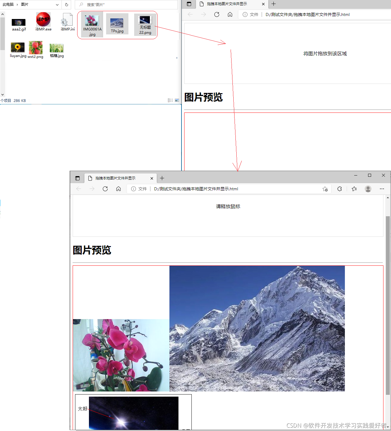 保存为文件名为:拖拽本地图片文件并显示.html
