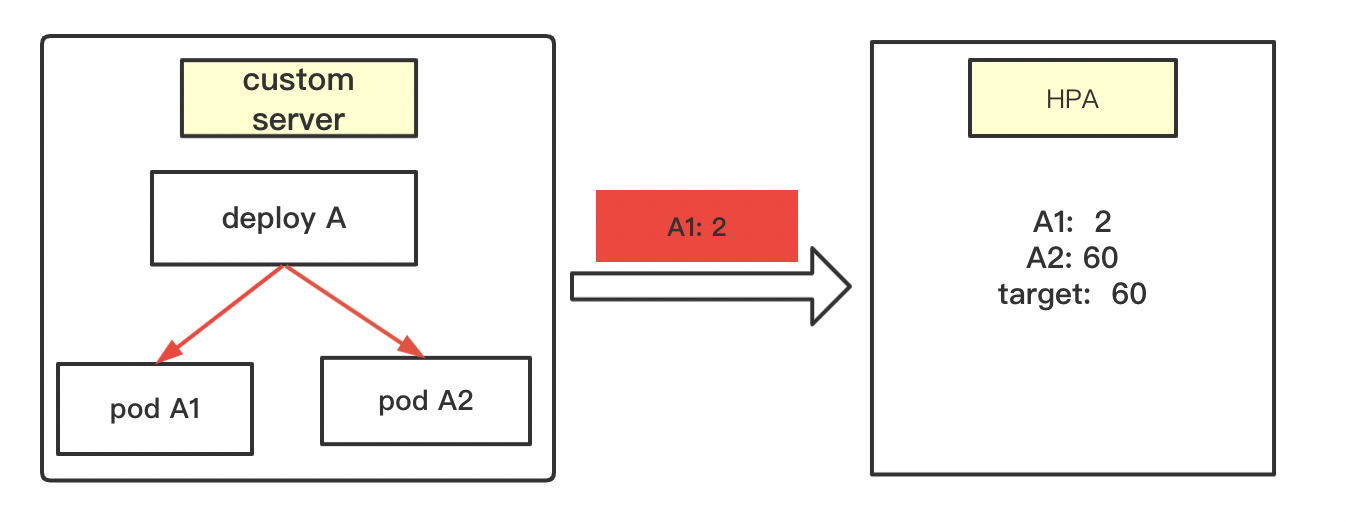 Custom server: 自定义metric服务。这里是一个抽象,用于给hpa提供具体的metric值。Custom server具体可以是prometheus,或者其他的监控系统。下一篇文章会讲如何将Custom server和hpa联系起来。