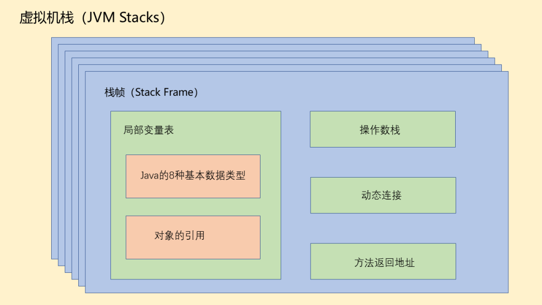 每个方法被执行的时候,都会在虚拟机栈中同步创建一个栈帧(stack frame)。