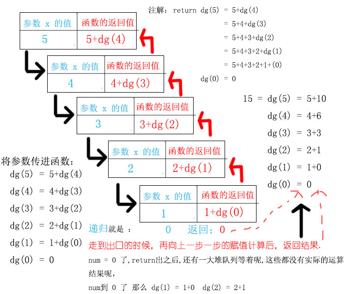 走到出口的时候,再向上一步一步的赋值计算后,返回结果。那当 num = 0 了, return出之后 还有一大堆队列等着, return num + dg(num - 1) 这些都没有实际的运算结果呢。return 0; ;到了0,就把0赋值进去,然后一个一层层的向上赋值最终达到dg(5),然后把计算结果return 出去。。