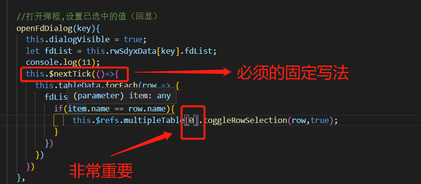 3:上面的 this.$refs.multipleTable.toggleRowSelection(row); 必须要放在 this.$nextTick(()=>{})中才可以执行(啥意思,俺就不知道了)