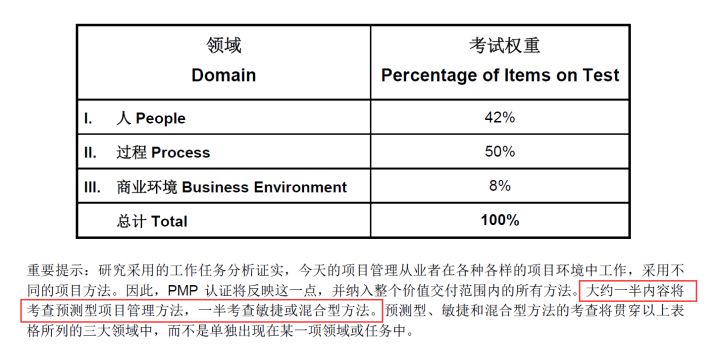 五大过程组变为三大模块:人、过程、商业环境,且敏捷内容增加到50%,那就意味着考试的难度增加,考试的教材多了一本——ACP考试官方制定教材《敏捷实践指南》。