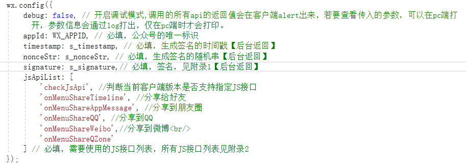 config接口调用完后就可调用ready接口和error接口,这2个接口是代表config是否验证成功的。分享的功能可以封装到一个方法中,然后在ready接口中进行调用。下面直接放代码。