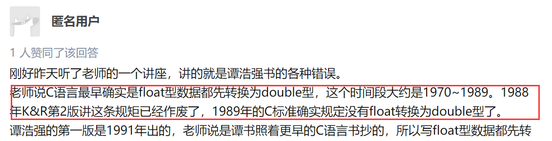 笔者之前看到一些教材关于自动类型转换章节的知识点写到:1.float型数据参与运算时,先转换为double型数据再计算;2.float型数据 与 int型数据运算,先将两者转换为double型,再运算。与笔者的实操结果不符,于是经过充分的查阅后,发现上述知识点已经是30年前过时老掉牙的用法了。今天笔者通过官方标准、代码证明、教材错误来源 来充分证明。