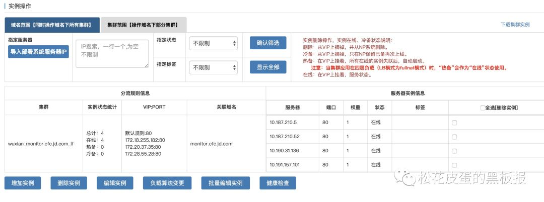 事实上,负载均衡检查到在线的实例状态都异常时,会尝试使用处在备份(热备)状态的实例,如果还是失败,就会返回503 service unavailable错误。同理,负载均衡节点(VIP)也有在线和热备的状态。