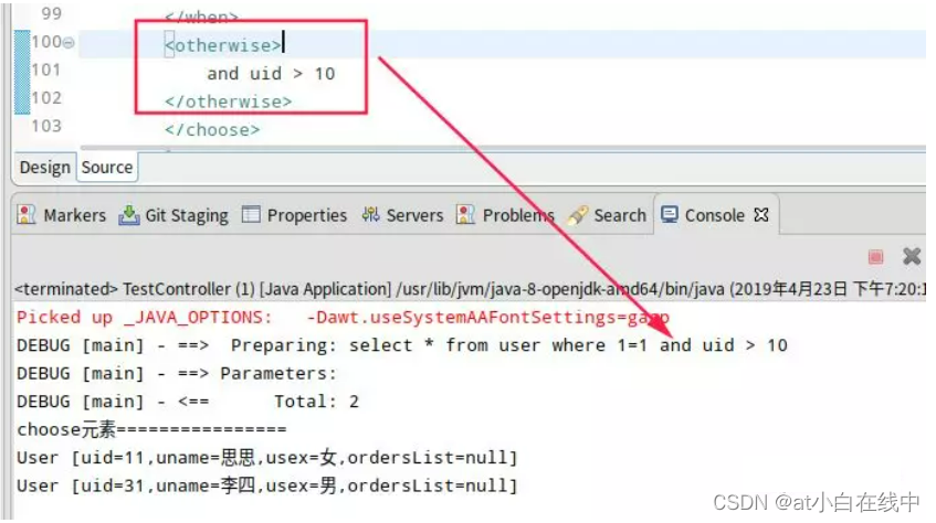 }我们例子中传入uname和usex为空,所以执行了<otherwise>元素中的语句,如图: