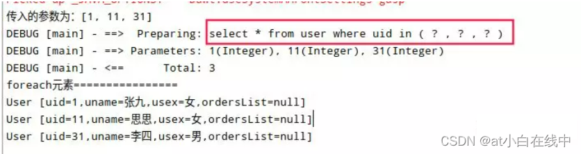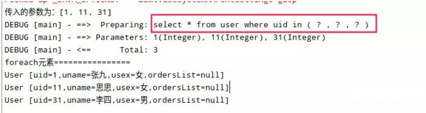 }拼接后的SQL语句为:select * from user where uid in ( ? , ? , ? ) 。结果如图: