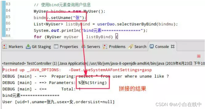 在模糊查询时,如果使用“${}”拼接字符串,则无法防止SQL注入问题。如果使用字符串拼接函数或连接符号,但不同数据库的拼接函数或连接符号不同,如MySQL的concat函数、Oracle的连接符号“||”。这样,SQL映射文件就需要根据不同的数据库提供不同的实现,显然是比较麻烦,且不利于代码的移植。幸运的是,MyBatis提供了<bind>元素来解决这一问题。