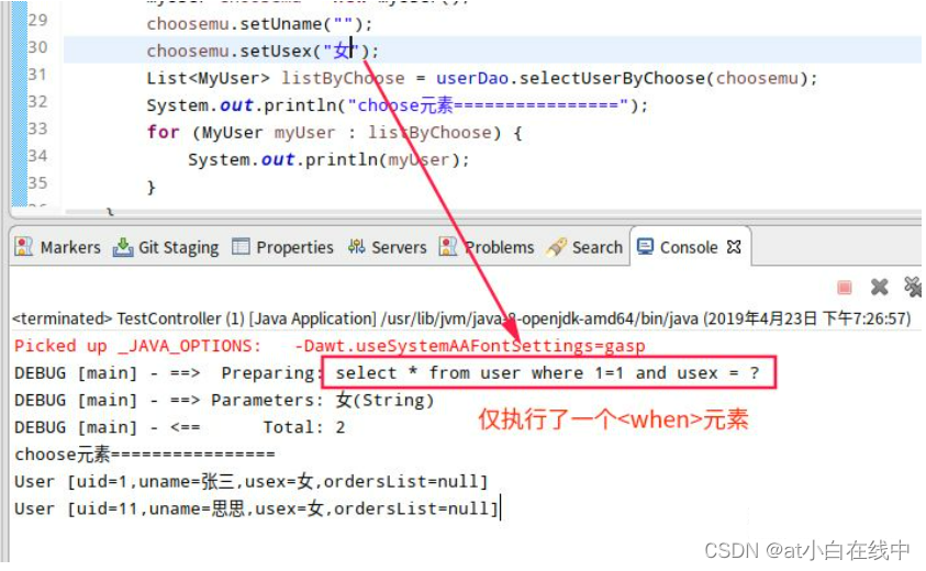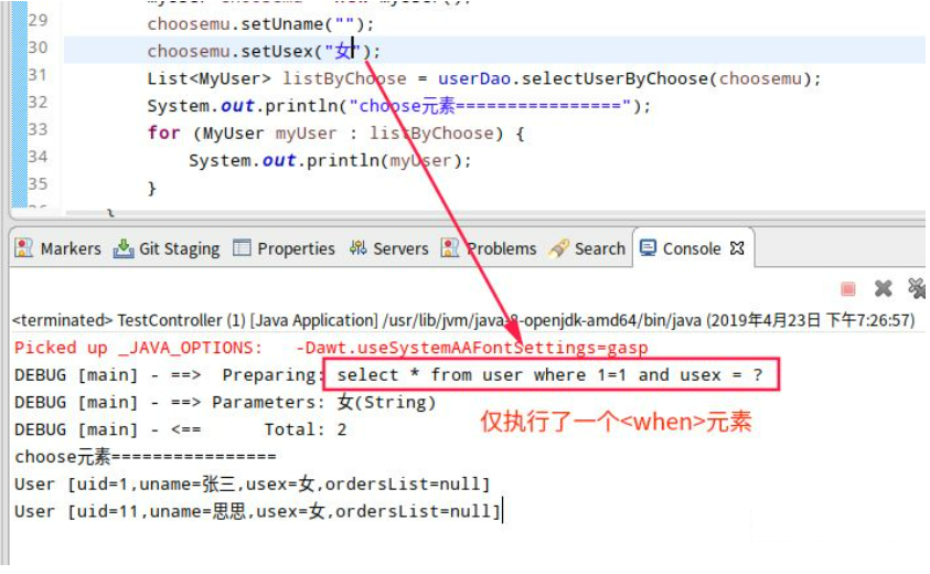 }结果如下,当不为usex空时,仅执行了这个 <when test="usex !=null and usex!=''">元素。