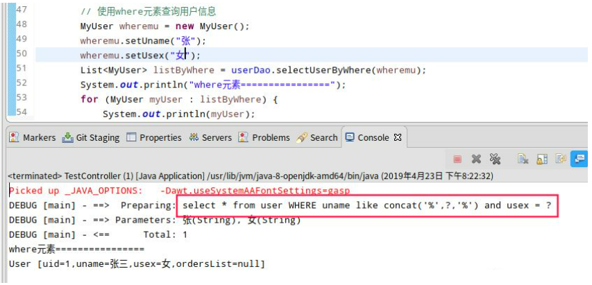 List<MyUser> listByWhere = userDao.selectUserByWhere(wheremu);