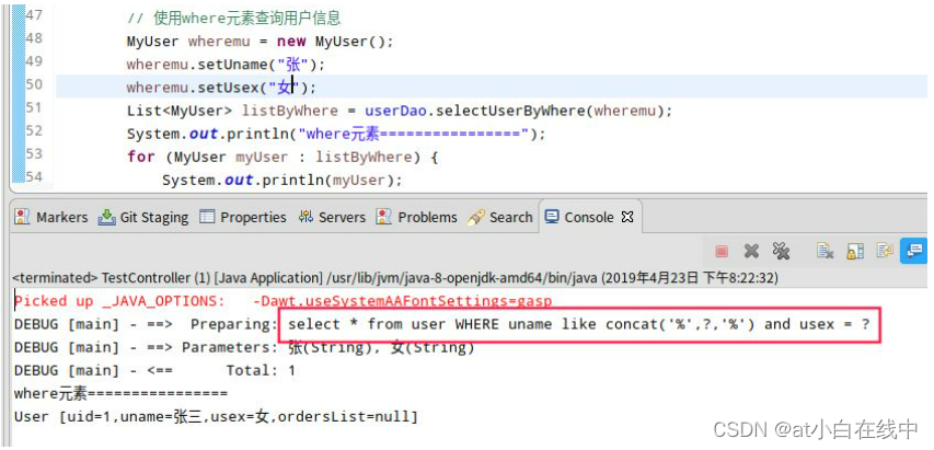 }从测试结果中我们可以看到Mybatis智能拼接了SQL语句,加上"where"前缀,同时去掉了"and"后缀。