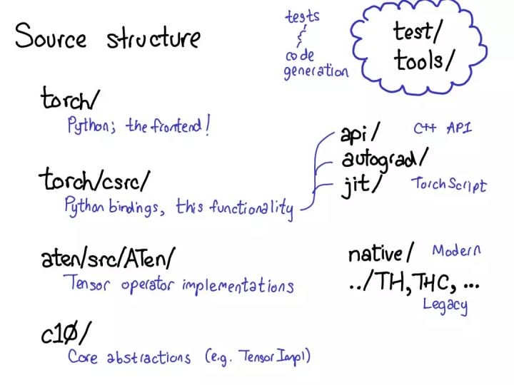 PyTorch 有大量文件夹,在 CONTRIBUTING.md 文档中有对它们的非常详细的描述,但实际上你只需知晓 4 个目录: