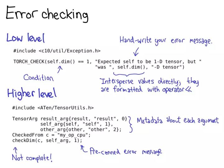错误检查可以在低层 API 完成,也能通过高层 API 实现。低层 API 只是一个宏 TORCH_CHECK,其接收的是一个布尔值,然后还有任意数量的参数构成错误字符串(error string)以便得出结论看该布尔值是否为真。