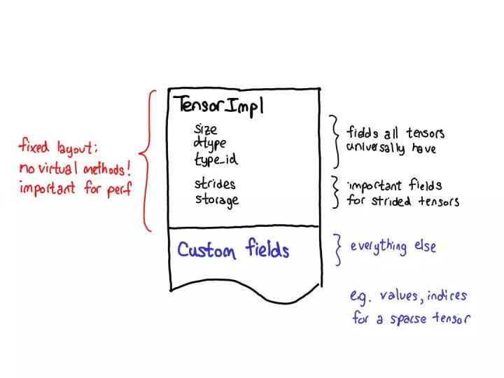 所以当你查看一个张量的实际布局时(定义为 TensorImpl 结构),会看到所有字段的一个公共前缀——我们认为所有类似「张量」的东西都会有;还有一些字段仅真正适用于有步幅的张量,但它们也很重要,所以我们将其保留在主结构中;然后可以在每个张量的基础上完成有自定义字段的后缀。比如稀疏张量可将其索引和值存储在这个后缀中。