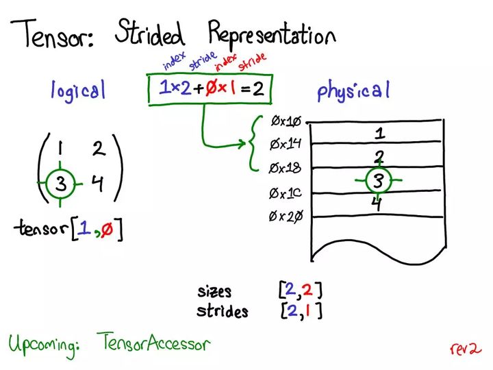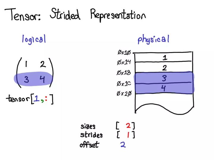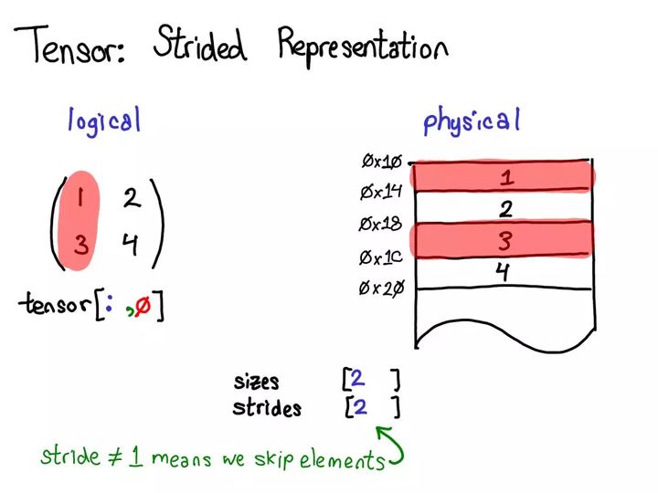 步幅表示实际上可以让你表示所有类型的张量域段;如果你想了解各种不同的可能做法,请参阅 https://ezyang.github.io/stride-visualizer/index.html