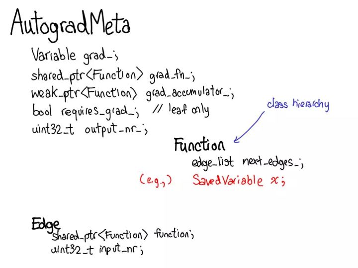 要做到这一点,我们需要在张量上执行运算时存储更多元数据。让我们调整一下我们对张量数据结构的图:现在不只是一个指向存储的张量,我们还有一个包装这个张量的变量,而且也存储更多信息(AutogradMeta),这是用户在自己的 PyTorch 脚本中调用 loss.backward() 执行 autograd 时所需的。