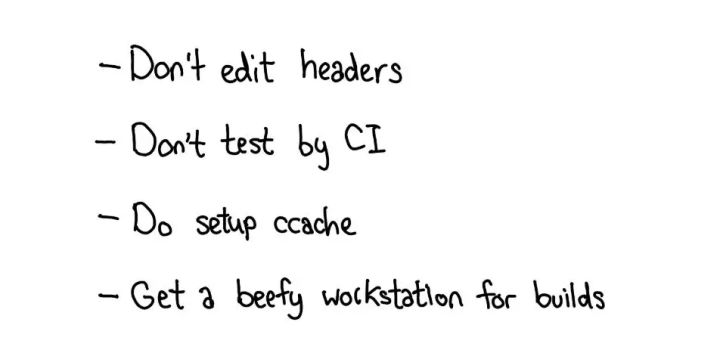 - 贡献指南解释了如何设置 ccache:https://github.com/pytorch/pytorch/blob/master/CONTRIBUTING.md#use-ccache ;强烈建议这个,因为这可以让你在编辑 header 时幸运地避免大量重新编译。当我们在不应该重新编译文件时重新编译时,这也能帮你覆盖我们的 build 系统的漏洞。