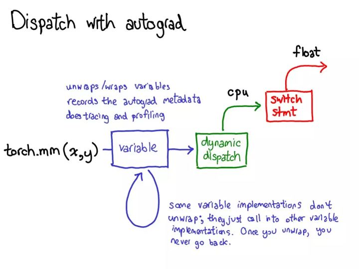 在我们调度到 CPU 或 CUDA 实现之前,还有另一个对变量的调度,其负责打开(unwrap)变量,调用底层实现(绿色),然后再重新将结果包装进变量并为反向过程记录必需的 autograd 元数据。