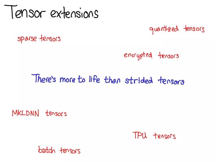因为我们已经谈过了张量,所以我还想花点时间谈谈张量扩展。毕竟,除了密集的 CPU 浮点数张量,还有其它很多类型的张量,比如 XLA 张量、量化张量、MKL-DNN 张量;而对于一个张量库,还有一件需要思考的事情:如何兼顾这些扩展?