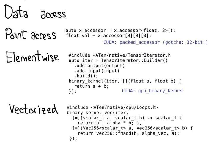 ();,我们会做一次运行时间测试以确保张量确实是这种格式;但那之后,每次存取都不会被检查。张量存取器能正确地处理步幅,因此你最好使用它们,而不是原始的指针访问(不幸的是,很多传统的核是这样做的)。另外还有 PackedTensorAccessor,这特别适用于通过 CUDA launch 发送存取器,这样你就能从你的 CUDA 核内部获取存取器。(一个值得一提的问题:TensorAccessor 默认是 64 位索引,这比 CUDA 中的 32 位索引要慢得多!) - 如果你在用很常规的元素存取编写某种算子,比如逐点运算,那么使用远远更高级的抽象要好得多,比如 TensorIterator。这个辅助类能为你自动处理广播和类型提升(type promotion),相当好用。