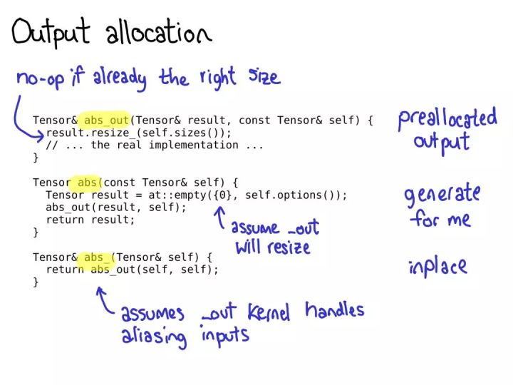 在用 PyTorch 写算子时,有一点很重要:你往往要注册三个算子:abs_out(其操作的是一个预分配的输出,其实现了 out= keyword 参数)、abs_(其操作的是 inplace)、abs(这只是一个算子的普通的旧功能版本)。