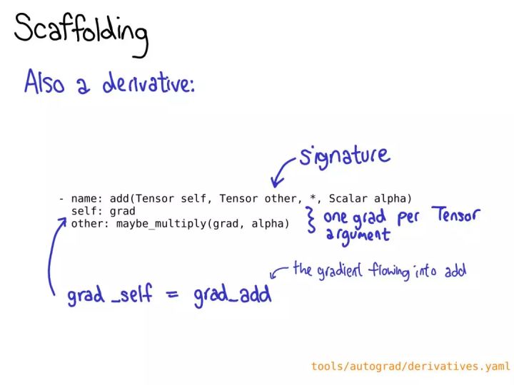 如果你是一位 PyTorch 高级用户,你可能已经熟悉其中大部分材料了。我们也会谈到「扩展点(extension points)」的三个概念、布局(layout)、设备(device)和数据类型(dtype),这能引导我们思考张量类的扩展的方式。在 PyTorch 纽约聚会的现场演讲中,我略过了有关自动梯度(autograd)的幻灯片,但我在这里会进行一些讲解。