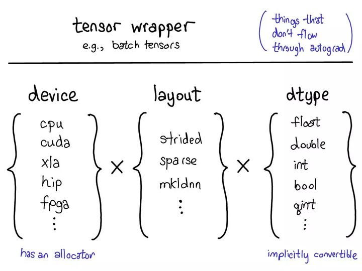 如果你想为 PyTorch 张量添加一种扩展,你应该思考你想要扩展这些参数中的哪几种。这些参数的笛卡尔积定义了你可以得到的所有可能的张量。现在,并非所有这些组合都有核(谁为 FPGA 上的稀疏量化张量用核?),但原则上这种组合可能有意义,因此我们至少应该支持表达它。