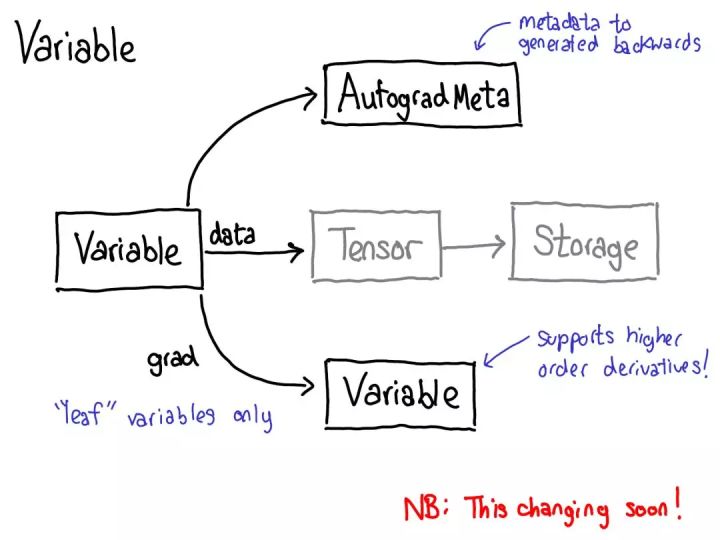 这张幻灯片的内容在不久的将来就会过时。Will Feng 在简单融合了 PyTorch 的前端端口之后,正在推动 C++ 中变量和张量的融合:https://github.com/pytorch/pytorch/issues/13638。