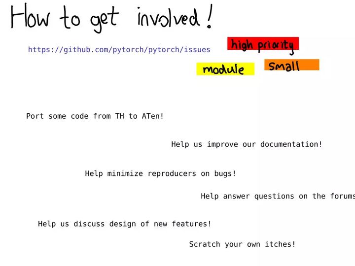 即使你并不想马上就开始写代码,也仍有很多其它有用的工作值得去做,比如改善文档(我很喜欢合并文档 PR,它们都很赞)、帮助我们重现来自其他用户的 bug 报告以及帮助我们讨论问题跟踪器上的 RFC。没有我们的开源贡献者,PyTorch 不会走到今天;我们希望你也能加入我们!