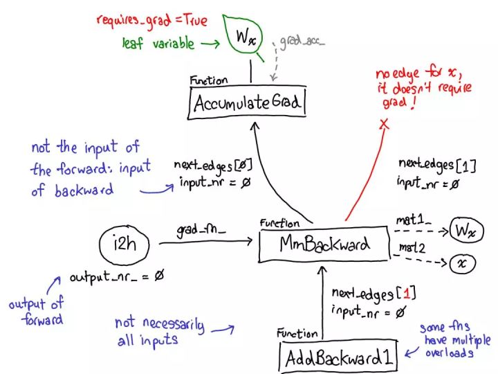 - 首先将你的目光投向红色和蓝色的变量。PyTorch 实现了反向模式自动微分,这意味着我们可以「反向」走过前向计算来有效地计算梯度。查看变量名就能看到这一点:在红色部分的底部,我们计算的是损失(loss);然后在这个程序的蓝色部分,我们所做的第一件事是计算 grad_loss。loss 根据 next_h2 计算,这样我们可以计算出 grad_next_h2。从技术上讲,我们加了 grad_ 的变量其实并不是梯度,它们实际上左乘了一个向量的雅可比矩阵,但在 PyTorch 中,我们就称之为 grad,基本上所有人都知道这是什么意思。