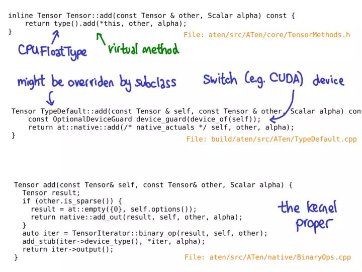 在这个特定案例中,这个虚调用会调度到在一个名为 TypeDefault 的类上的 add 的实现。这刚好是因为我们有一个对所有设备类型(CPU 和 CUDA)都一样的 add 的实现;如果我们刚好有不同的实现,我们可能最终会得到 CPUFloatType::add 这样的结果。正是这种虚方法的实现能让我们最终得到实际的核代码。