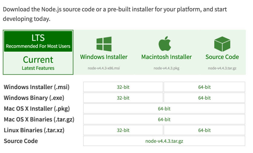 Node.js 安装包及源码下载地址为:https://nodejs.org/en/download/。根据自己电脑的需要进行安装