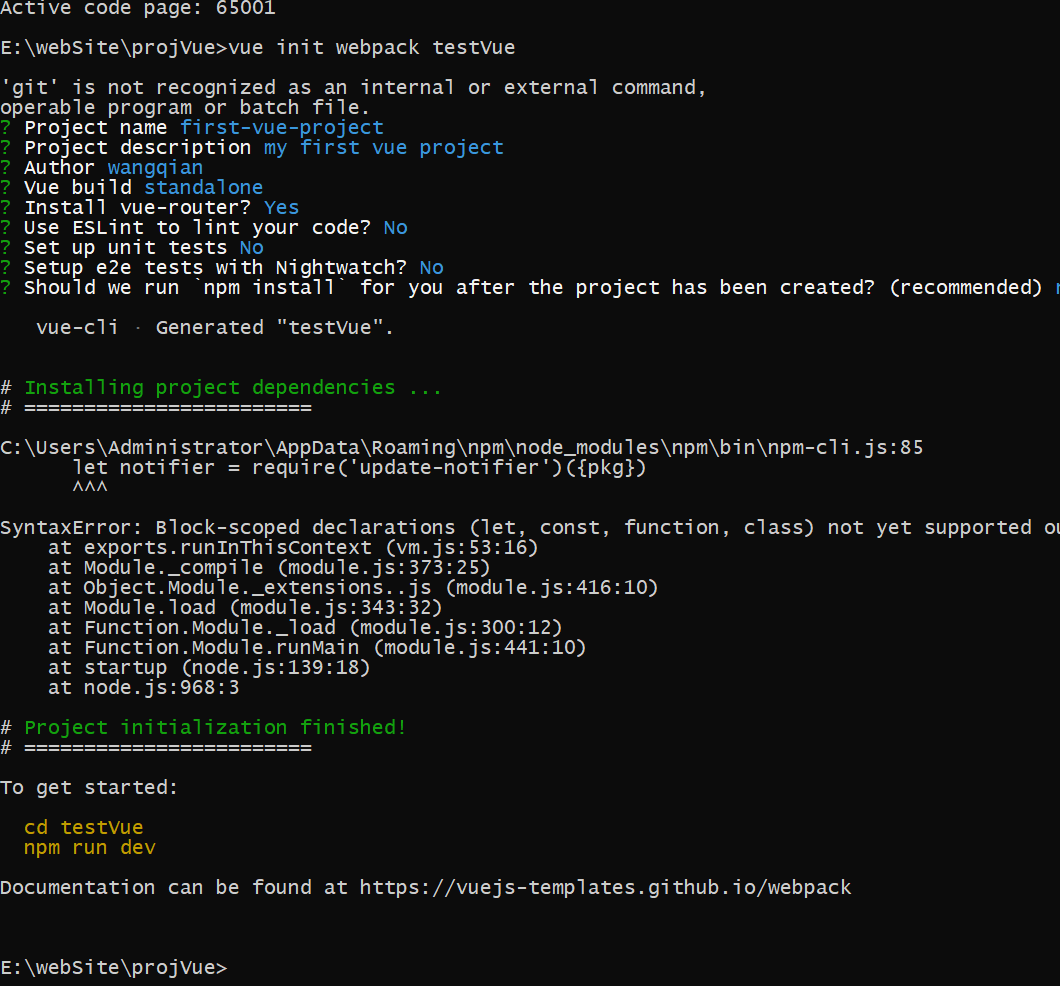 下面为我自己新建的工程(我自己新建了E:\wenSite\projVue文件路径,执行 vue init webpack testVue后,按照蓝颜色的字输入后如下图所示,执行完毕,E:\wenSite\projVue路径下出现testVue文件)