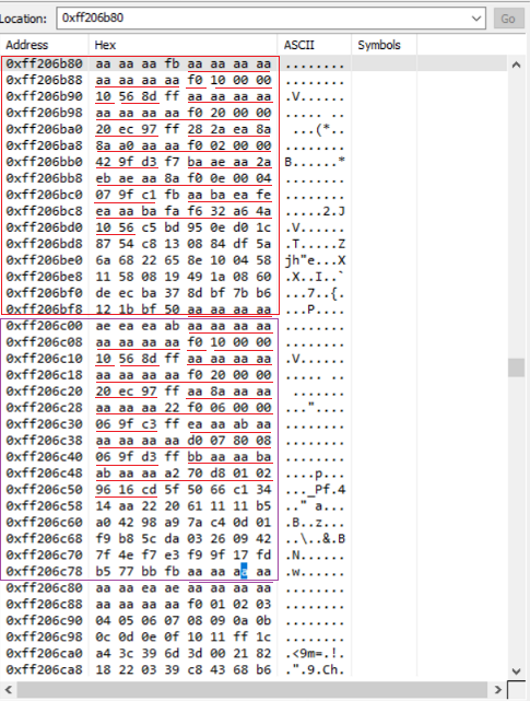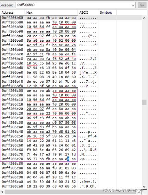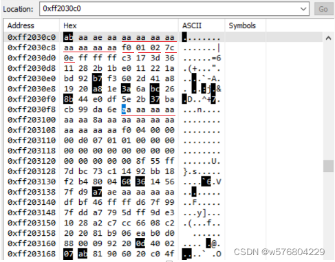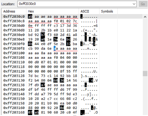 对照第2小节的表格,我们发现,除了表格中的数据外,其他offset字段下也有数据。以下截图是我用E1从0XFF2030C0的地址处读到的数据,我猜测没有写过数据的区域,E1读到的是随机值,但是执行Blankcheck操作,未写过数据的区域,返回值为True。这里我们不必关心其他位置上的数据,只关心表格中的数据即可。