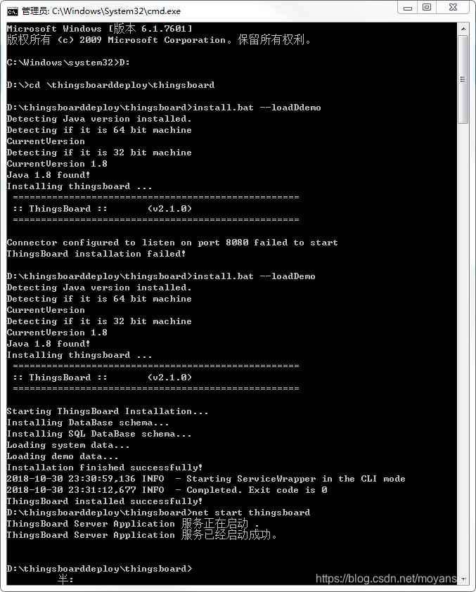 运行install.bat脚本将ThingsBoard作为Windows服务安装(或运行“install.bat -loadDemo”来安装和添加演示数据)。这意味着它将在系统启动时自动启动。类似地,uninstall.bat将从Windows服务中删除ThingsBoard。输入“install.bat --loadDemo”后等待安装完成就行:注意:我这里的因为我的8080端口被其他应用占用了,所以第一次安装失败,关掉占用8080端口的程序后,重新输入“install.bat -loadDemo”可以了