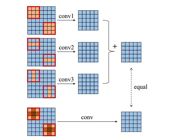 我们试图以不对称卷积可以等效地融合到标准方内核层中的方式来使用,这样就不会引入额外的推理时间计算负担。 我们注意到卷积的一个有用特性:如果几个具有兼容大小的2D内核在相同的步幅上以相同的步幅运行以产生具有相同分辨率的输出,并且将它们的输出相加,我们可以将这些内核在相应的位置上相加为 获得将产生相同输出的等效内核。也就是说,即使具有不同的内核大小,可加性也适用于2D卷积,