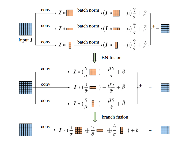 BN融合。 卷积的同质性允许随后的批归一化和线性缩放转换等效地融合到卷积层中,并增加了偏差。 从等式可以看出。 2对于每个分支,如果我们构造一个新的内核为