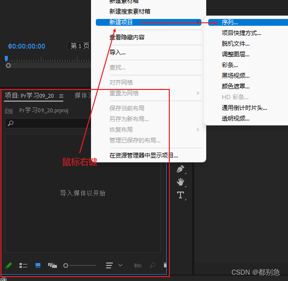 鼠标右键左下角的【项目展示区域】-【新建项目】-【序列】