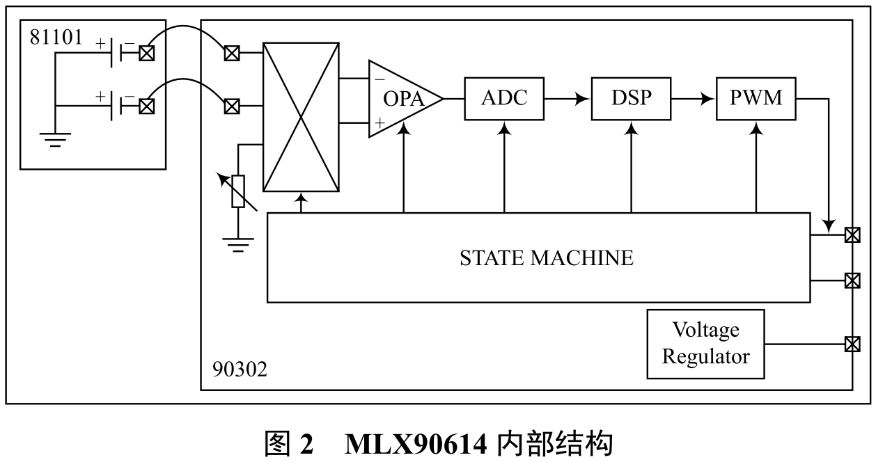 红外测温模块采用 Melexis 公司出品的 MLX90614 系列高精度红外测温芯片,为 TO-39 封装,封装中集成了红外测温传感器芯片和用于信号处理的芯片。信号处理芯片具有低噪声放大、高精度数模转换、数字信号处理等功能。温度计进行了出厂校准,以满足高精度和高分辨率的要求。MLX90614 有默认的 SMBus(系统管理总线)和 10 位数字PWM 输出模式,此 PWM 模式可应用于连续监测物体温度,监测温度范围为 -20 ~ 120 ℃,分辨率为 0.14 ℃,其内部结构如图 所示。