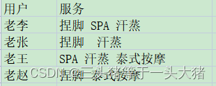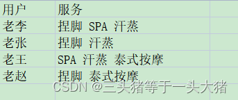 比如在下面这份数据中,有四个事务,{捏脚}是一项集,{捏脚,SPA}是二项集。