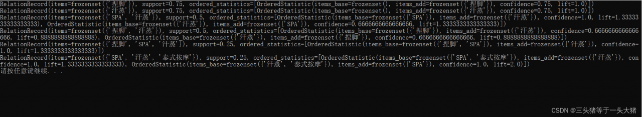 注意到,一条记录的结构是这样的:RelationRecord[items,support,ordered_statistics[item_base,item_add,confidence,lift]]