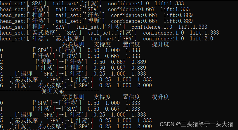 由此可知,有SPA+汗蒸的套餐都挺受欢迎。那上面提到的{捏脚}→{泰式按摩}这个组合,为什么没有在最终的输出里出现呢?原因:{捏脚}→{泰式按摩}的置信度是0.333...,在创建强关联规则的时候就被排除了。apriori()函数中,我设定的最小置信度是0.6,大于0.333。当然最小置信度和最小支持率都是可以根据实际要求调整的。