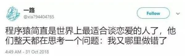 程序员是最适合当对象的人!因为他时时刻刻的都会想,自己到底哪里做错了!程序怎么就是运行不起来呢