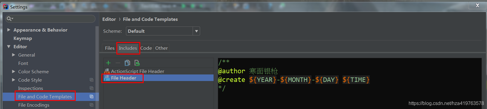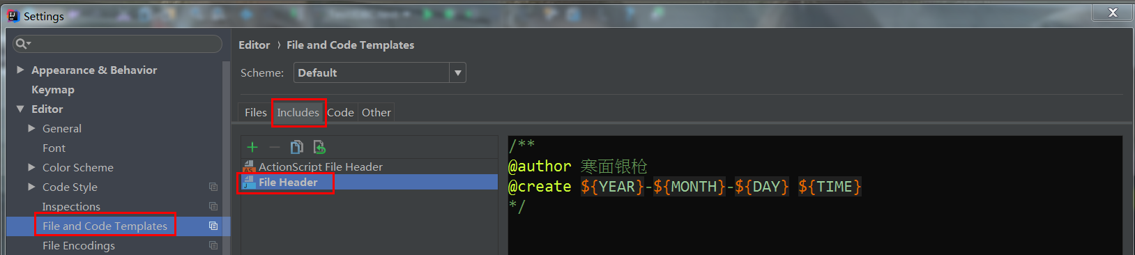 设置:Editor->File and Code Templates->右边选Includes标签->File Header