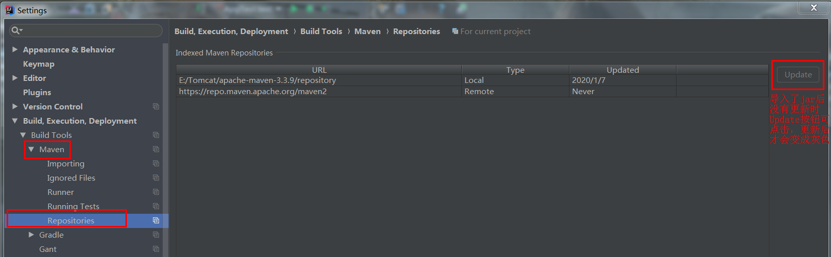 设置:Maven->Repositories->右侧本地仓库点update(没有导入新jar包时按钮为灰色)