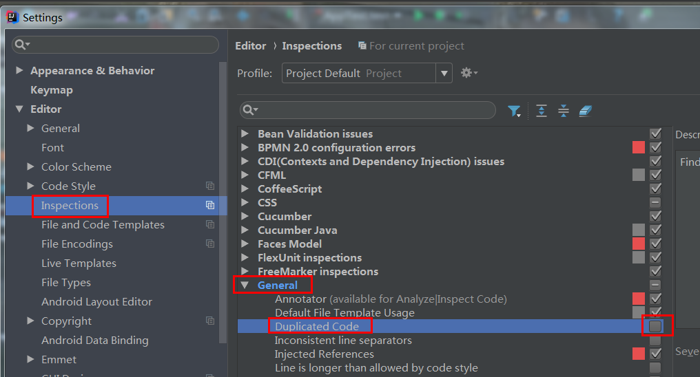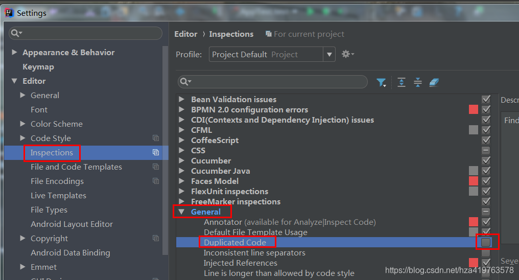 重复代码检查:设置里:Inspections->General->Duplicated Code去掉勾