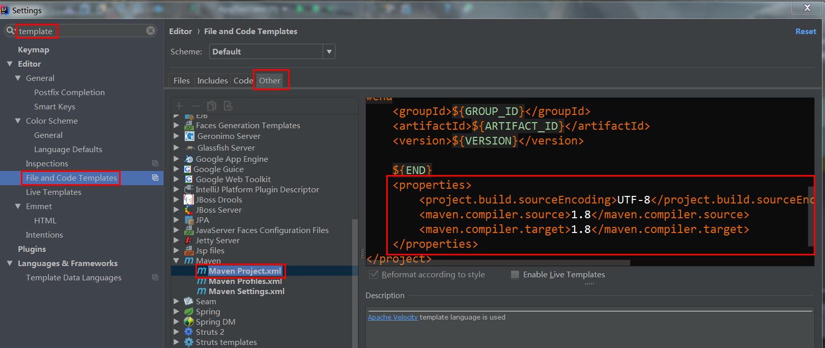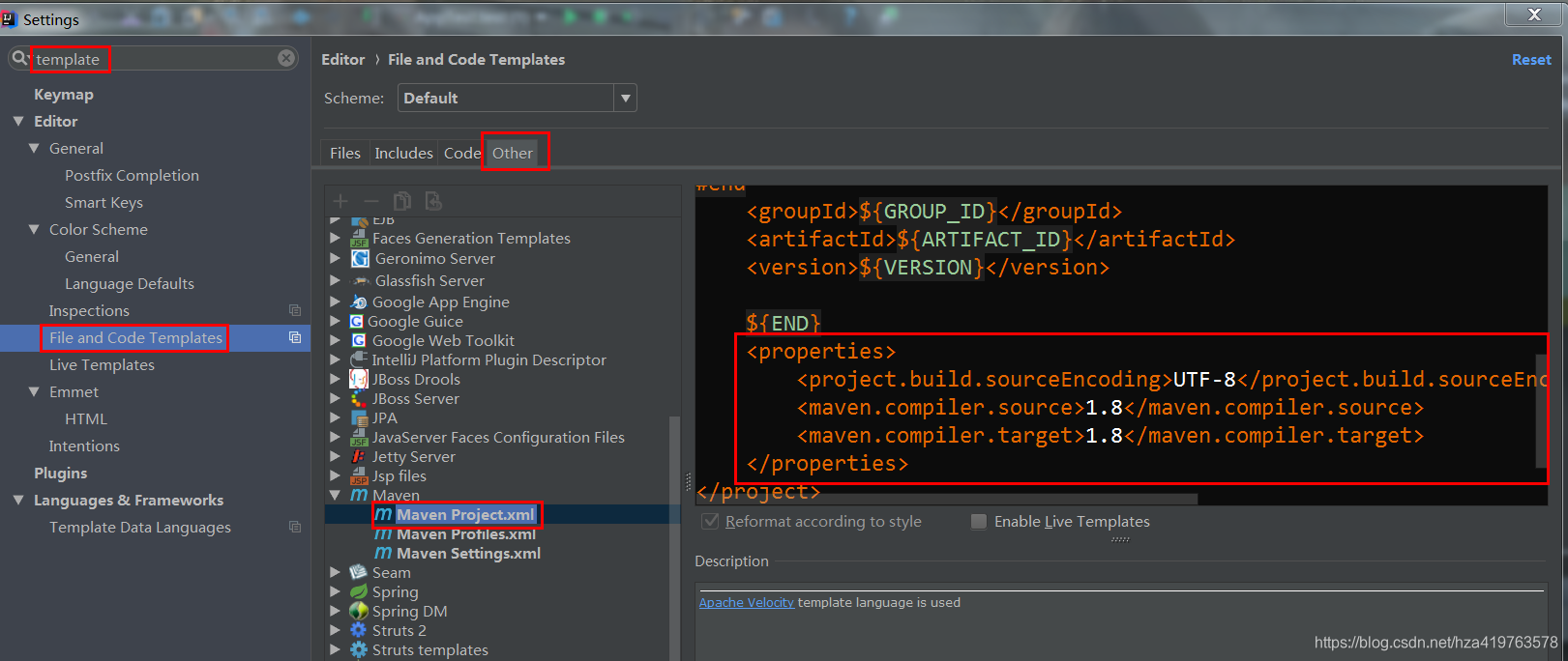 设置搜索template:File and Code Templates ->右边Other->Maven->Maven Project.xml ->加入: