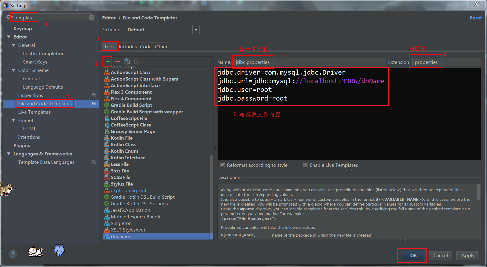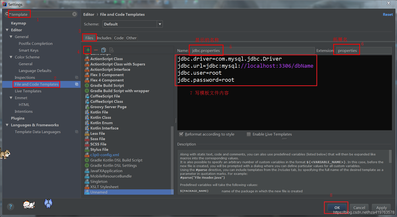 settings->搜索template->File and Code Templates-> Files->+->填文件名name,拓展名Extension->编辑模板内容